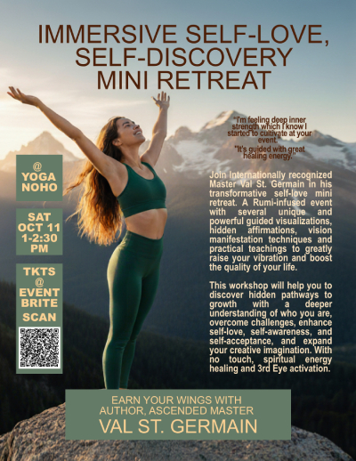 2. IMMERSIVE SELF-LOVE / SELF-DISCOVERY EXPERIENCE MINI-RETREAT This is a popular Rumi-infused immersive self-love event with practical teachings, several powerful guided visualizations, unique affirmations and vision manifestation techniques to raise your vibration and boost the quality of your life. It includes spiritual healing energy boost and 3rd Eye activation. This workshop will help you to discover hidden pathways to growth with a deeper understanding of who you are, overcome challenges, enhance self-love, self-awareness, and self-acceptance, and expand your creative imagination. > Press for Happiness is Loving Yourself: Yahoo News | LA Times | Hoodline. Level 3. COSMIC ASCENSION A fully guided experience into the highest level of spiritual attainment on this planet, the Ascension. Includes a toolbox into maintaining the growth, the expansion and the liberation. Level 3. DISCOVER YOUR SOUL'S MISSION AND UNLOCK YOUR SUPERPOWERS Accelerate your path to growth (5D). Support, enhance and reaffirm your unique personal and spiritual journey. Understand universal and spiritual mysteries. Discover hidden pathways to growth, overcome challenges, enhance self-love, with powerful guided visualizations, affirmations & unique vision manifestation techniques. Level 4. SPIRITUAL AWAKENING: AWAKEN, HEAL, NURTURE, ENHANCE, EXPAND AND MANIFEST. Master Val St. Germain has launched a powerful new fully immersive spiritual awakening mini retreat that is infused with his healing and awakening energy. The path to true spiritual enlightenment is self-discovery, self-acceptance and self-love and this workshop will gift you the hidden tools for a deep dive into the yet undiscovered you. Level 1. THE RUMI TRANSMISSION. A celebration of healing, growth and love. With powerful and passionate Rumi poetry presented by a Modern Master, with untold stories and anecdotes of Rumi's colorful and unconventional life, and Rumi energy healing and much more, followed by a Q&A session. We are now looking to bring these powerful events to California. |